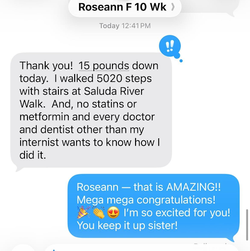 She was 75 years old and living in South Carolina. She hired me as her Nutritionist because she was in constant pain from double knee surgery, high cholesterol levels (in the 280s!) and a limited ability to move. She couldn't go places or do the things she loved. Weight loss was secondary for her.